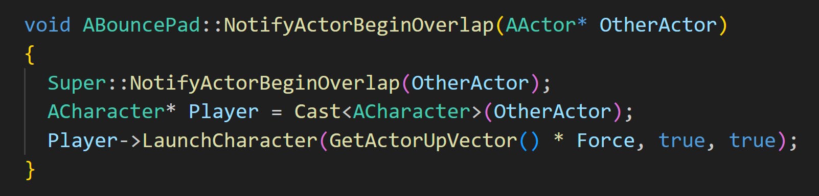 I chose to Cast from AActor to ACharacter instead of implementing an interface. Because for the first brief only players should be affected by the bumpers.
