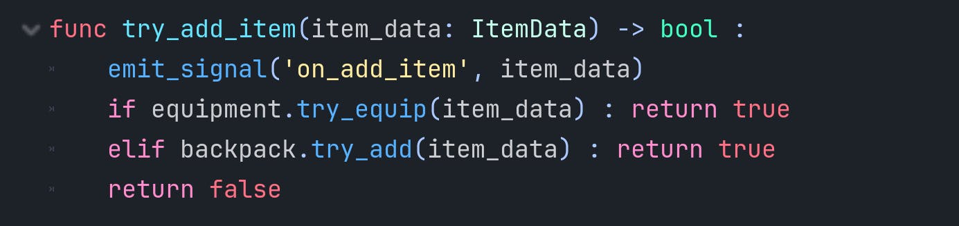 The core of the inventory is multiple helper functions that returns a boolean to be able to chain the logic. If success returns true if fail returns false. Depending on this it can select the correct behaviour. Here is the outer most layer of this logic: